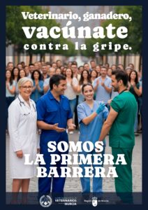 El Ilustre Colegio Oficial de Veterinarios de la Región de Murcia (ICOVRM) hace un llamamiento a todos los profesionales veterinarios y ganaderos para que se vacunen frente a la gripe en la campaña estacional de este otoño-invierno. La entidad, junto con la Consejería de Salud de la Región de Murcia, ha editado un cartel informativo
