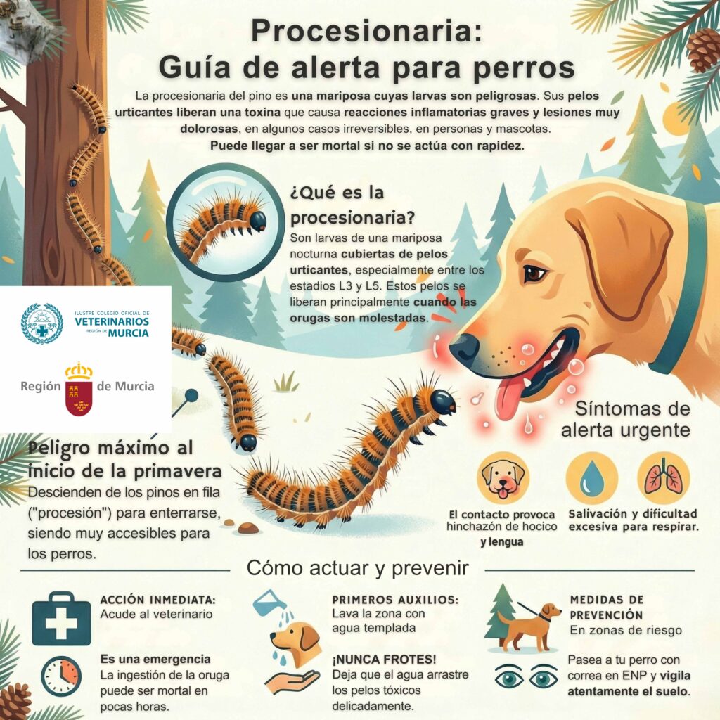 La fase más peligrosa es cuando las orugas descienden desde la parte alta del pino hasta el suelo (en procesión), ya que es el momento en el que existe mayor riesgo de que las mascotas entren en contacto con ellas.